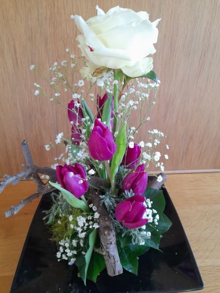 | Het thema vandaag is: Jezus wordt gevangen genomen. Jezus is op de Olijfberg. Hij is bang en bidt tot God. De witte roos stelt Jezus voor. De paarse tulpen staan symbool voor gebed. Paars is de kleur van rouw. Gipskruid betekent verwarring, de dorre takken betekenen ondergang. |