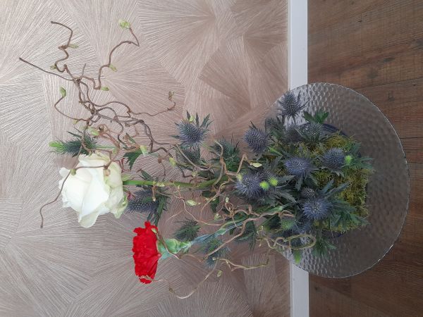 | Het thema 22 maart is: Petrus zegt dat hij Jezus niet kent. Drie keer zegt iemand tegen Petrus dat hij ook bij Jezus hoort, maar drie keer antwoordt Petrus dat hij Jezus niet kent. Als hij beseft wat hij gedaan heeft, is hij heel verdrietig. De rode anjer stelt Petrus voor, de veren symboliseren het gekraai van de haan. Gipskruid betekent verwarring. |
