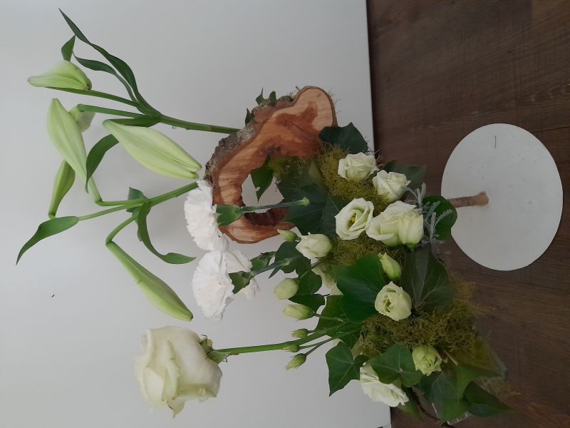 Het thema vandaag is: Jezus is opgestaan! Jezus is gestorven, maar Hij staat op uit de dood. De vrouwen ontdekken dat het graf van Jezus leeg is. Twee engelen vertellen hen dat Jezus is opgestaan uit de dood. Als de vrouwen dat aan de leerlingen vertellen, gaat Petrus meteen naar het graf. De twee lelies symboliseren de engelen bij het open graf, de boomstronk met het gat staat voor het open graf. De 3 anjers verbeelden de vrouwen, de roos symboliseert Petrus. Wit is de kleur van reinheid en van feest. |