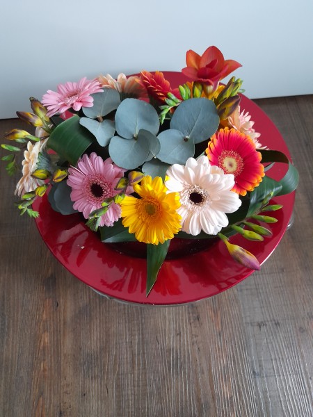 | Thema: Wees welkom Vandaag: Sofia uit Brazilië. Iedereen, ook wie weinig heeft, is welkom aan tafel. De schikking stelt een tafel voor waar iedereen welkom is om aan zitten. De verschillende kleuren gerbera’s geven weer dat iedereen er, ongeacht je afkomst, bij mag zijn. Fresia’s symboliseren gedeelde vreugde. |