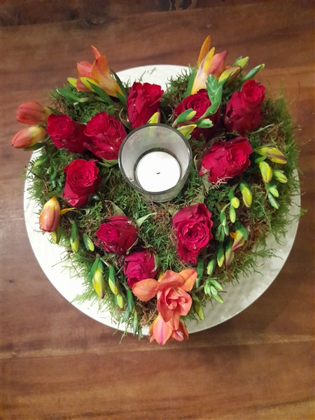 De schikking heeft de vorm van een hart, gevuld met rode roosjes en fresia’s. Rode rozen zijn het symbool van liefde, fresia’s symboliseren gedeelde vreugde. Mos betekent liefde als van een moeder.