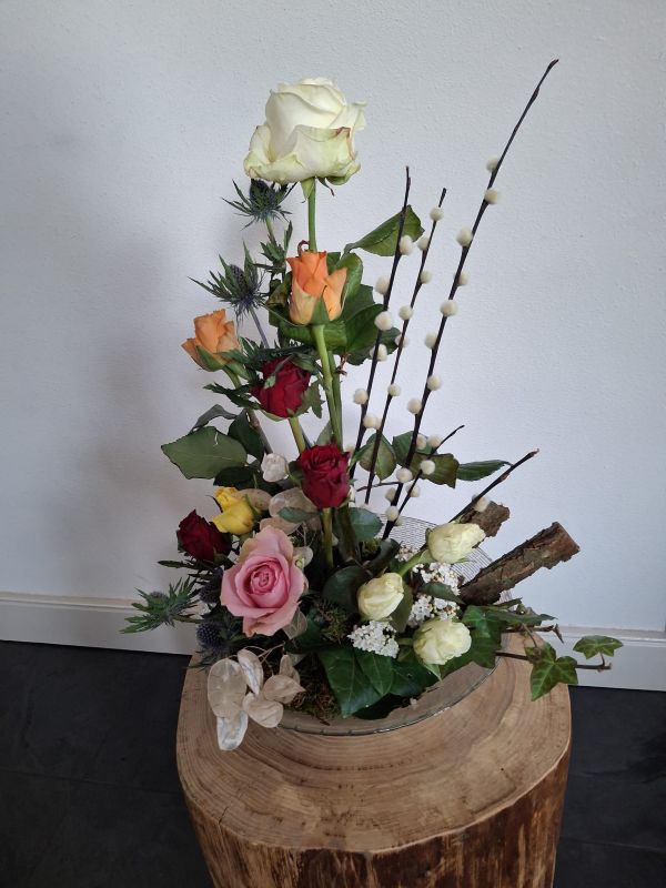 | Lucas 19:45-48; Jezus gaat de tempel binnen en begint de handelaars en kopers eruit te jagen, de witte roos stelt Jezus voor, de gekleurde roosjes stellen de verschillende mensen voor, de judaspenning dat zijn de handelaren, de blauwe distel en de braam tak dat zijn de felle woorden die Jezus sprak. De witte bloemen en het mos zijn de rust en gebed die Jezus voor ogen staan. |